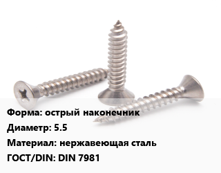 Саморез острый наконечник D=5.5 нержавеющая сталь ГОСТ: DIN 7981