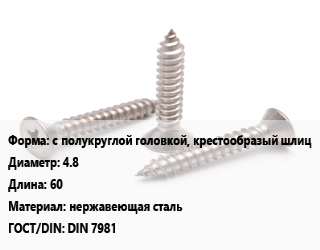 Саморез с полукруглой головкой, крестообразый шлиц D=4.8 L=60 нержавеющая сталь ГОСТ: DIN 7981