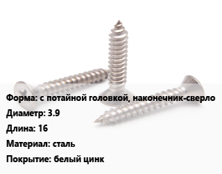 Саморез с потайной головкой, наконечник-сверло D=3.9 L=16 сталь белый цинк, кг, для оконного профиля цена от 96 ₽ / кг, где купить, условия доставки в Ярославле и Ярославской области