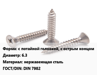 Саморез с потайной головкой, с острым концом D=6.3 нержавеющая сталь ГОСТ: DIN 7982, упаковка 2000 шт цена от 5 477 ₽ / кг, где купить, условия доставки в Ярославле и Ярославской области