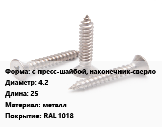 Саморез с пресс-шайбой, наконечник-сверло D=4.2 L=25 металл RAL 1018, шт цена По запросу где купить, условия доставки в Ярославле и Ярославской области