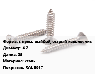 Саморез с пресс-шайбой, острый наконечник D=4.2 L=25 сталь RAL 8017, упаковка 1000 шт цена от 404.54 ₽ / кг, где купить, условия доставки в Ярославле и Ярославской области
