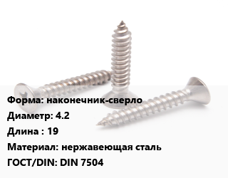 Саморез наконечник-сверло D=4.2 L=19 нержавеющая сталь ГОСТ: DIN 7504, упаковка 35 шт цена от 60.3 ₽ / кг, где купить, условия доставки в Ярославле и Ярославской области