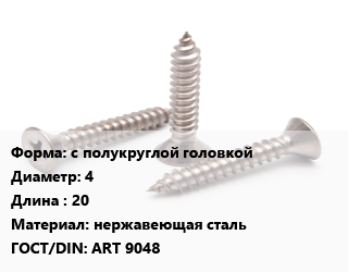 Саморез с полукруглой головкой D=4 L=20 нержавеющая сталь ГОСТ: ART 9048, кг, для дерева, по запросу цена от 197.84 ₽ / кг, где купить, условия доставки в Ярославле и Ярославской области