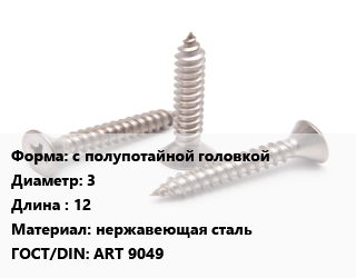 Саморез с полупотайной головкой D=3 L=12 нержавеющая сталь ГОСТ: ART 9049, упаковка 50000 шт цена от 4 580 ₽ / кг, где купить, условия доставки в Ярославле и Ярославской области