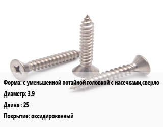 Саморез с уменьшенной потайной головкой с насечками,сверло D=3.9 L=25 оксидированный, упаковка 12000 шт цена от 2 602 ₽ / кг, где купить, условия доставки в Ярославле и Ярославской области