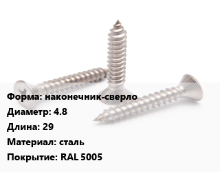 Саморез наконечник-сверло D=4.8 L=29 сталь RAL 5005, упаковка 400 шт цена от 1 068 ₽ / кг, где купить, условия доставки в Ярославле и Ярославской области