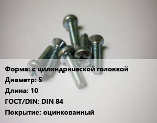 Винт с цилиндрической головкой 5х10 DIN 84 оцинкованный, цена за шт, кг цена от 2.7 ₽ / кг, где купить, условия доставки в Ярославле и Ярославской области