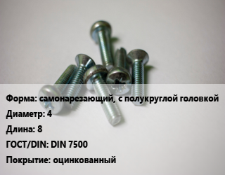 Винт самонарезающий, с полукруглой головкой 4х8 DIN 7500 оцинкованный, 4.8, цена за шт, кг цена По запросу где купить, условия доставки в Ярославле и Ярославской области