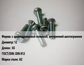 Винт с цилиндрической головкой, внутренний шестигранник 12х65 DIN 912 Сталь: A2, по запросу, кг цена от 29.79 ₽ / кг, где купить, условия доставки в Ярославле и Ярославской области