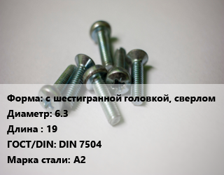 Винт с шестигранной головкой, сверлом 6.3х19 DIN 7504 Сталь: А2, нержавеющий, цена за шт, кг цена от 4.14 ₽ / кг, где купить, условия доставки в Ярославле и Ярославской области