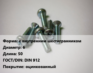 Винт с внутренним шестигранником 6х50 DIN 912 оцинкованный, 10.9,8.8, цена за шт,1 кг,Китай,упаковка 1 кг, кг цена от 349.13 ₽ / кг, где купить, условия доставки в Ярославле и Ярославской области