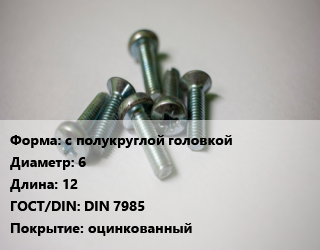 Винт с полукруглой головкой 6х12 DIN 7985 оцинкованный, 4.8, КНР, цена за 1000 шт,РМЗ, цена за 1000 шт,цена за 100 шт,цена за 1000 шт,цена за 200 шт,цена за упаковку,цена за шт,ЧП, цена за 1000 шт,шлиц Phillips, кг цена от 1 028 ₽ / кг, где купить, условия доставки в Ярославле и Ярославской области