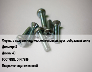 Винт с полуцилиндрической головкой, крестообразный шлиц 8х40 DIN 7985 оцинкованный, кг цена от 119.97 ₽ / кг, где купить, условия доставки в Ярославле и Ярославской области