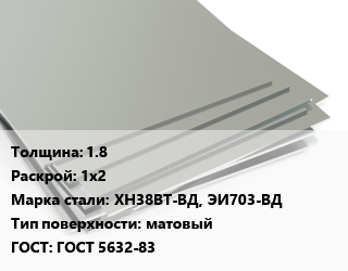 Лист нержавеющий 1.8 1х2 Сталь: ХН38ВТ-ВД, ЭИ703-ВД Тип:матовый ГОСТ 5632-83
