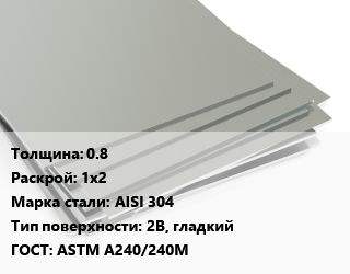 Лист нержавеющий 0.8 1х2 Сталь: AISI 304 Тип:2B, гладкий ASTM А240/240М